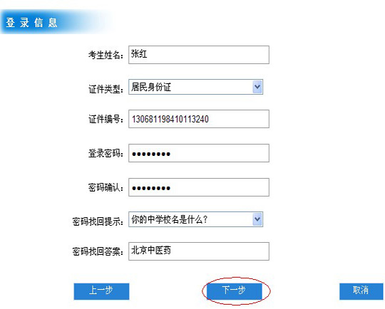 步驟3、填寫登錄信息(所有項(xiàng)均為必填項(xiàng)),點(diǎn)擊下一步。如下圖: