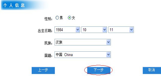 步驟5、填寫個(gè)人信息,點(diǎn)擊下一步。如圖所示: