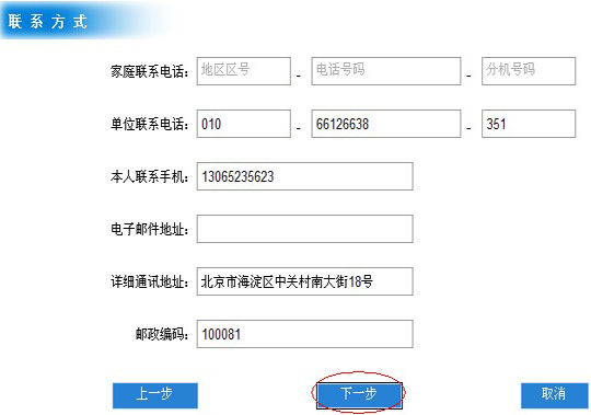 步驟6、填寫聯(lián)系方式,點(diǎn)擊下一步(家庭聯(lián)系電話、單位聯(lián)系電話、電子郵件為選填)。如圖所示: