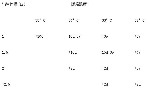 (一)保暖 出生后立即采取保暖措施,如采用輻射式保暖床、暖箱、熱水袋等。早產兒應根據體重、日齡選擇中性溫度。出生體重愈低,中性溫度應愈高,詳見下表。適宜的相對濕度為50%~60%。保暖時注意事項:①新生兒頭部占體表面積20.8%,經頭顱散熱量大,低體溫嬰兒應戴絨布帽;②體溫低或不穩定的嬰兒不宜淋浴;③使用熱水袋時應注意避免燙傷;④放置母親胸前保暖時應注意避免產婦因疲勞熟睡而致新生兒口、鼻堵塞,窒息死亡。