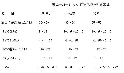 (四)血液氣體分析 新生兒和嬰兒的肺功能不易檢查,但可作血氣分析以了解氧飽和度水平及血液酸堿平衡狀態,為診斷治療提供客觀依據。小兒動脈血液氣體分析正常值見表12―11―1.