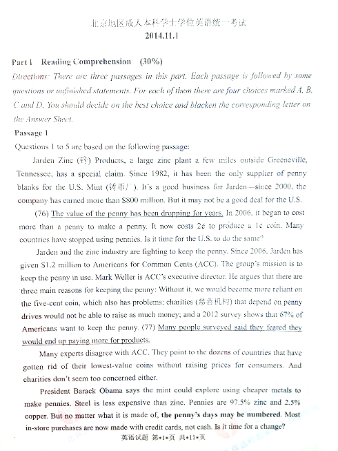 北京市2014年11月成人英語三級真題