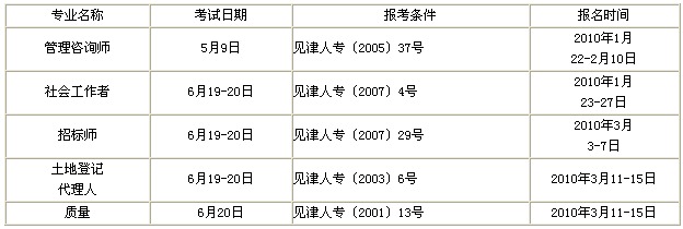 根據人力資源和社會保障部辦公廳《關于2010年度專業技術人員資格考試計劃及有關問題的通知》(人社廳發〔2009〕117號)安排,現將《2010年度管理咨詢師等五種專業技術人員資格考試報名工作安排表》印發給你們,并將有關問題通知如下: