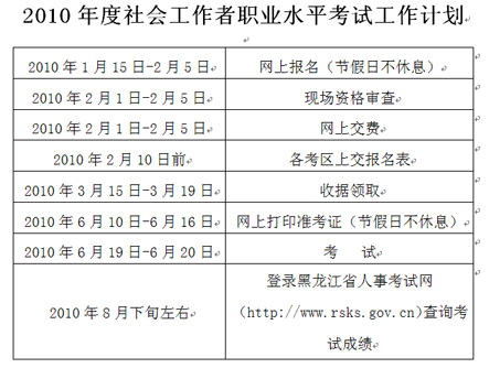 報名時間:2010年1月15日-2月5日(節假日可報名)。報名考生登錄黑龍江省人事考試網(http://www.rsks.gov.cn)的“網上報名”欄目,按照社會工作者考試網上報名系統規定的程序和要求,填寫個人信息,上傳照片,從網上直接打印報名表(報名表用A4紙打印,供現場資格審查時使用)。