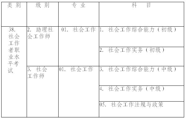 助理社會工作師考試科目分為《社會工作綜合能力(初級)》和《社會工作實務(初級)》2科,考生須一次通過2科方可取得助理社會工作師職業資格證書。社會工作師考試科目分為《社會工作綜合能力(中級)》、《社會工作實務(中級)》和《社會工作法規與政策》3科,考生可在連續兩個考試年度內通過全部科目后,獲得社會工作師職業資格證書。