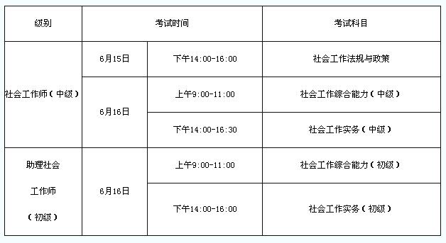 2013年度社會工作者職業(yè)水平考試定于6月15日至16日舉行,具體考試時間和考試科目如下: