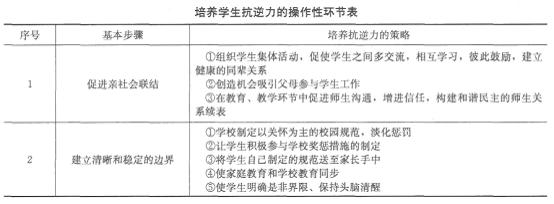 抗逆力是指個人面對生活逆境時,能夠理性地作出正向的、建設性的選擇方法和應對策略的能力。從構成要素上看,抗逆力由外部支持因素、內在優勢因素以及效能因素三部分組成。下表是學校培養學生抗逆力的操作性環節。