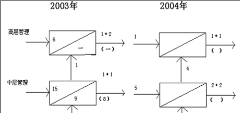 2、某公司2003―2004年度管理人員變動情況如圖1所示,2004年度各級管理人員的補充是通過外部招聘的方式來完成的,公司高層在總結本年度人力資源管理工作經驗的基礎上,做出了以下人策:首先,2005年度除一般管理人員可以通過外部各種招聘渠道補充之外,其他各層次管理人員一律由公司內部選拔;其次,各個層次的管理人員補充需要量嚴格按照公司制定的定員標準執行,不得突破額定人數;最后,要妥善安排好提升受阻的后備人才。2005年管理崗位人員接替統計表見表1。