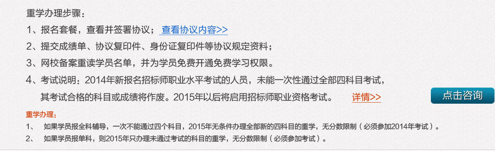 2、如果學員報單科輔導,則2015年只辦理未通過考試的科目的重學,無分數限制(必須參加考試)。