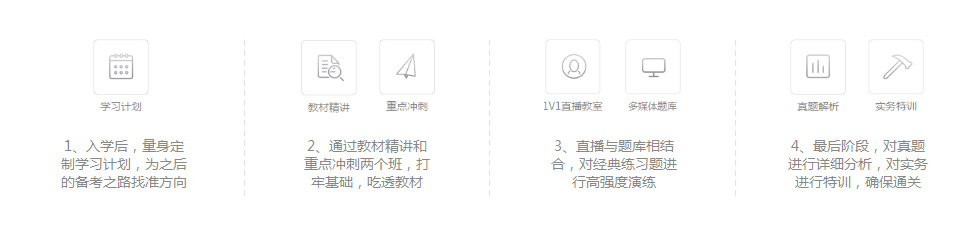 以"教材精講"和"重點沖刺"為基礎(chǔ)課程,吃透教材;以"1V1直播教室"和"多媒體題庫"為習(xí)題課程,提升做題技巧,再配上"實務(wù)特訓(xùn)"課程和應(yīng)試技巧課,全面系統(tǒng)學(xué)習(xí)。 |