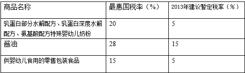 為積極增加進(jìn)口,滿足國內(nèi)經(jīng)濟(jì)社會發(fā)展及消費(fèi)需求,2013年我國將對780多種進(jìn)口商品實(shí)施低于最惠國稅率的年度進(jìn)口暫定稅率。其中,新增和進(jìn)一步降低稅率的產(chǎn)品主要分為五大類,一是調(diào)味品、特殊配方嬰幼兒奶粉、心臟起搏器、血管支架等促進(jìn)消費(fèi)和改善民生,與人民群眾密切相關(guān)的生活和醫(yī)療用品;二是汽車生產(chǎn)線機(jī)器人、寬幅噴墨打印機(jī)、有機(jī)發(fā)光二極管顯示屏、電動汽車用逆變器模塊、鋰電子蓄電池、無級變速箱用鋼帶等促進(jìn)裝備制造業(yè)和戰(zhàn)略性新興產(chǎn)業(yè)發(fā)展的設(shè)備、零部件和原材料;三是高嶺土、云母片、鎢鐵、銻等能源資源性產(chǎn)品,以及船舶壓載水處理設(shè)備用過濾器、動車組用膠囊等有利于節(jié)能減排的環(huán)保產(chǎn)品;四是紫苜蓿、奶襯、自走式飼料攪拌投喂車等支農(nóng)惠農(nóng)產(chǎn)品;五是羽絨、亞麻短纖、全自動轉(zhuǎn)杯紡紗機(jī)等支持紡織行業(yè)發(fā)展的產(chǎn)品。