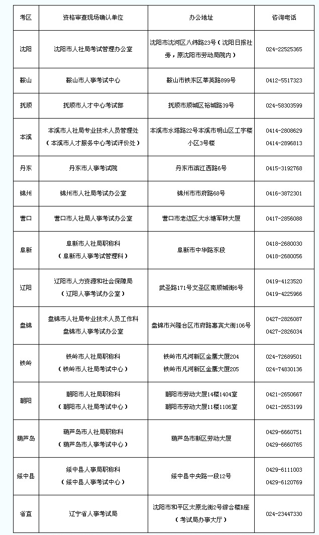 (三)報名時,我省報考人員(不含大連考生)請選擇“遼寧省”考區。駐沈的中、省直單位報考人員應選擇“省直”審核點,其他報考人員均按屬地化管理原則,選擇單位(或居住地)所在市或綏中縣為報名資格審核點。報名有關事宜咨詢電話詳見附件。
