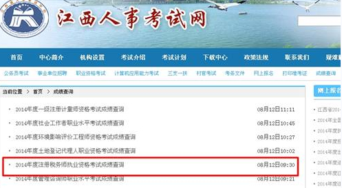 環球網校根據江西人事考試網得知,江西省2014注冊稅務師成績查詢入口已于08月12日09:30開始