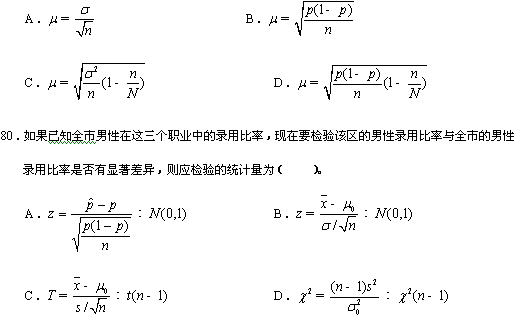 79.如果用該區的樣本數據推算全市男性在這三個職業中的錄用比率,采用純隨機重復抽樣的方法計算抽樣平均誤差的公式為( )。