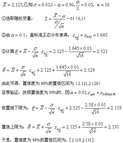 例6 從一批釘子中隨機抽取16枚,測得其長度(單位:cm)為2.14, 2.10, 2.13, 2.15, 2.13, 2.12, 2.13, 2.10, 2.15, 2.12, 2.14, 2.10, 2.13, 2.11, 2.14, 2.11.假設釘子的長度X服從正態分布N(μ,σ2),已知 ,求總體均值μ的置信度為90%的置信區間。
