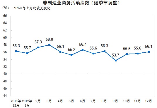 2012年12月,中國非制造業商務活動指數為56.1%,比上月上升0.5個百分點。
