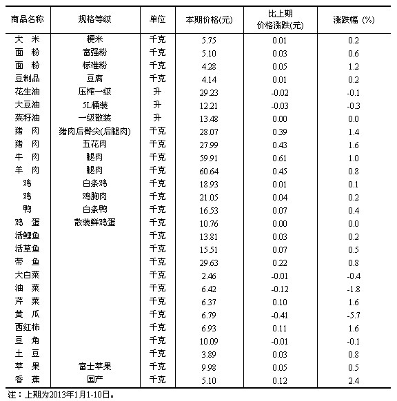 50個城市主要食品平均價格變動情況(2013年1月11-20日)