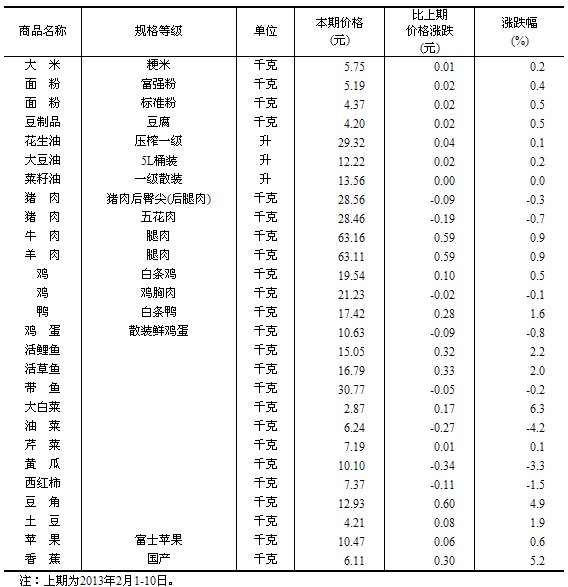 摘要 50個(gè)城市主要食品平均價(jià)格變動(dòng)情況(2013年2月11-20日)