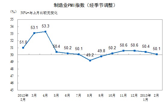 2013年2月,中國制造業采購經理指數(PMI)為50.1%,比上月下降0.3個百分點。