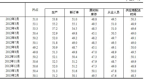 2013年2月中國制造業采購經理指數為50.1%