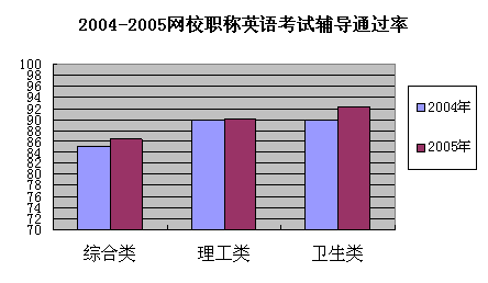 2005年輔導通過率:綜合類86.36%,理工類90.19%,衛生類92.31%,相比于2004年,綜合類通過率提高了1.36%,理工類提高了0.19%,衛生類提高了2.31%。