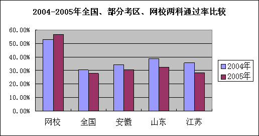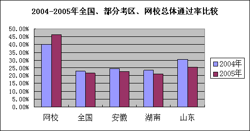 3.全科通過率。無論是全國、各考區還是網校,全科通過率都比2004年都有大幅度提高。2005年網校全科通過率為22.22%,是全國13.32%的1.67倍,分別是安徽15.20%、江蘇20.37%、山東17.57%的1.46倍、1.09倍、1.26倍。