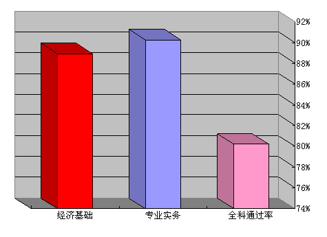 (一)科目通過率。網校經過統計得出2006年經濟師考試輔導經濟基礎知識單科通過率為88.91%,專業知識與實務由于科目繁多,未能按專業統計,只做綜合分析,其通過率為90.24%,同時報名網校經濟基礎知識和專業知識與實務并順利通過的考生占所有報名雙科學員的比例為80.2%。