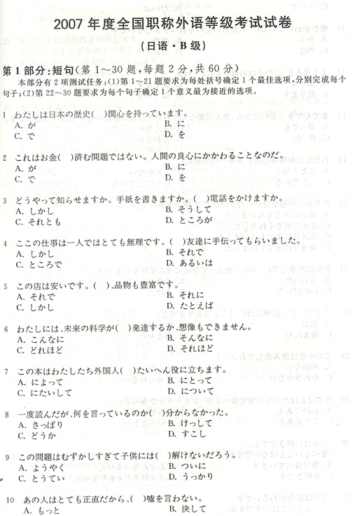 - 2012年職稱日語B級考試(短句)真題及答案2012-04-13