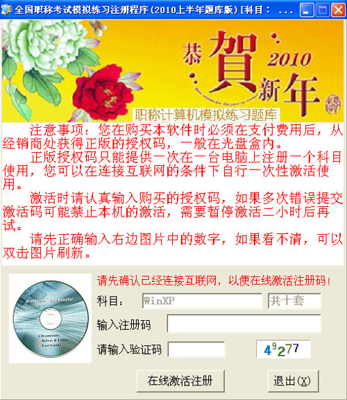 2、激活時,請先選好要使用的電腦,并確保電腦能夠連上互聯網(沒有寬帶的用戶可以使用電話線連接互聯網),然后運行程序安裝文件,將程序安裝到硬盤中,雙擊桌面上生成的圖標就可以運行本考試模擬系統了。運行任一套模擬試題,彈出注冊界面,在聯網的情況下將授權碼填入框中,在線激活即可正式使用本軟件的所有題庫,進入題庫后,輸入座位號和身份證號,座位號2位,身份證號18位,數字隨意。