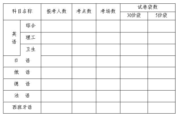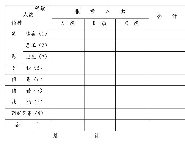 考試語種:英語、日語、俄語、德語、法語、西班牙語。其中,英語分為綜合、理工、衛生三個類別,每個類別分A、B、C三個級別,其他語種不分類別,只分A、B、C三個級別。考生可閱讀附件1后選擇報考級別。