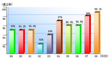 網(wǎng)校職稱英語輔導(dǎo)的通過率一直高居榜首。1999年、2000年、2001年均超過了95%。2002年雖然考試題型改變,難度有較大增加,但是輔導(dǎo)通過率仍達到了92%。而且在后面的幾年隨著經(jīng)驗的豐富通過率也不斷上升,2008年通過率達到了99.1%。具體數(shù)據(jù)如下圖所示: