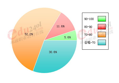 2008年職稱日語全國的合格標準是60分,部分省市和地區根據自當地的情況有適當的降分。環球網校該科目已通過學員考試成績分布為:合格―70分占30.6%;71-80分占52.2%;81-90占11.6%;91-100分為5.6%。 具體分布如下圖所示: