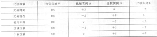 (3)該地塊與三個可比實例A、B、C的影響因素修正指數如下表4-1,表中數值表示各案例條件與待估房地產比較,負號表示案例條件比待估房地產差,正號表示案例條件比待估房地產好。
