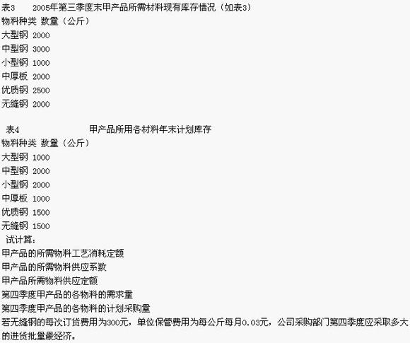 某機械制造公司計劃2005年第四季度生產甲產品600臺,根據工藝部門提供的資料,已知構成甲產品(零件)耗用各材料的凈重及單位產品所必需的工藝損耗情況(如表1)。另據生產供應部門的統計報告,已知2005年前3季度制造單位甲產品各有關材料非工藝損耗情況(如表2)與2005年第三季度末甲產品所需材料庫存情況(如表3),為保證2006年持續安全生產,公司物料倉儲部門也計劃甲產品所用各材料在年末保持適當的期末庫存(如表4)。