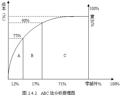 (2)ABC分析法。又稱重點選擇法或不均勻分布定律法,是指應用數理統計分析的方法來選擇對象。在價值工程中,這種方法的基本思路是:首先將一個產品的各種部件(或企業各種產品)按成本的大小由高到低排列起來,然后繪成費用累積分配圖(如圖2.4.2所示)。然后將占總成本70%—80%而占零部件總數10%—20%的零部件劃分為A類部件;將占總成本5%—10%而占零部件總數60%—80%的零部件劃分為C類;其余為B類。其中A類零部件是價值工程的主要研究對象。