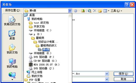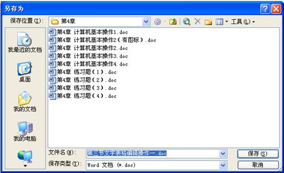 選擇三要素之后,單擊“保存”按鈕,該文檔以Word文檔(*.doc)類型、“第三章文字表格編輯操作一”文件名由內存保存到D:盤“瞿曉燕的講義”|“第4章”文件夾中。