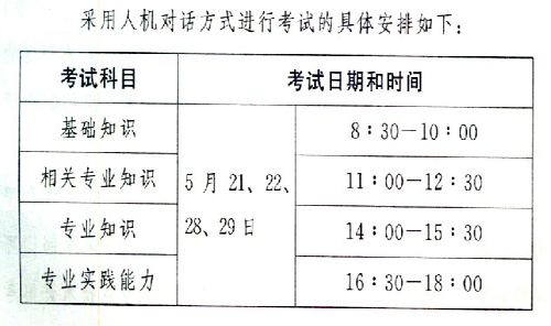 采用人機對話方式進行考試的時間(內科|外科|婦產科主治醫師采用人機對話方式):考試時間為5月21、22、28、29日,備注:參加人機對話考試的考生在一天內完成四個科目的考試。