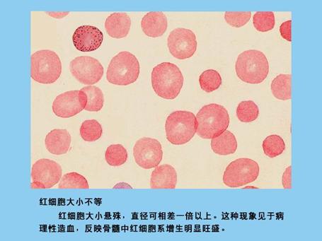 紅細胞直徑相差一倍以上,常見于各種重癥增生性貧血,巨幼細胞貧血時尤為明顯。