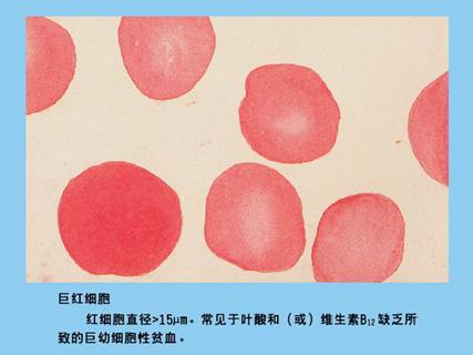 直徑大于15 μ m,見(jiàn)于缺乏葉酸和維生素B12所致的巨幼細(xì)胞貧血。在缺乏上述因子時(shí),幼稚紅細(xì)胞內(nèi)DNA合成不足,不能按時(shí)分裂所致。巨紅細(xì)胞中心淺染區(qū)消失。