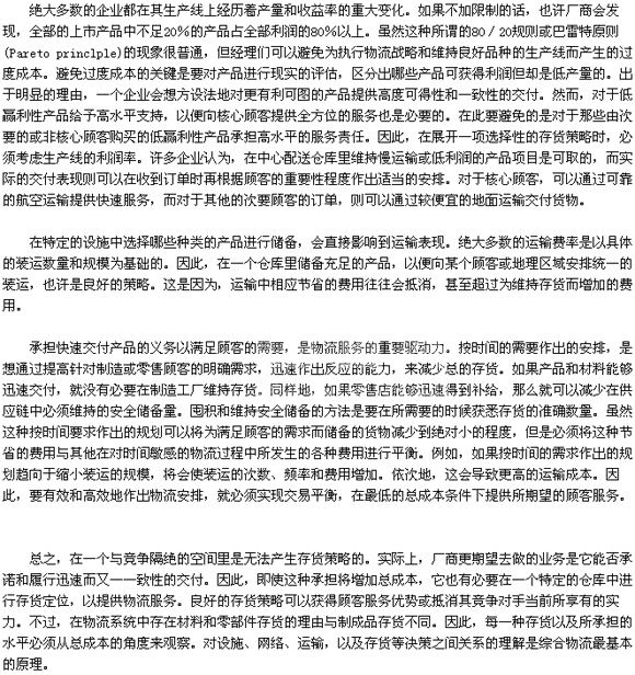 一個廠商的存貨需求取決于網絡結構和顧客服務期望的水平。從理論上講,廠商會在設施中儲備每一種銷售產品。以致力于為每一位顧客服務。但是,因為這種儲會增加總成本,而且對廠商來說,也有一定的風險,因而很少有哪種經營作業能承擔得起如此耗資的存貨義務。存貨的目的是要以始終與最低的總成本相一致的最低限度的存貨義務來實現所期望的顧客服務。雖然過度的存貨可以用來彌補物流網絡的基本設計中的不足,但在某種程度上卻降低了物流管理的質量,而且,把過度的存貨用作向顧客提供的服務,將最終導致更高的物流總成本。