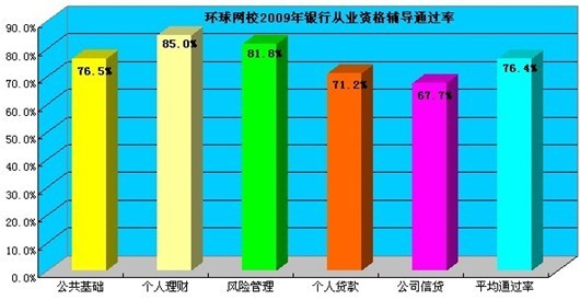 環球網校(www.edu24ol.com)通過對網校學員的回訪及學員的成績反饋,總結出網校2009年銀行從業資格考試輔導各科通過率分別為:公共基礎通過率為76.5%。個人理財通過率為85%。風險管理通過率為81.8%。個人貸款通過率為71.2%。公司信貸通過率為67.7%。平均通過率為76.4%。