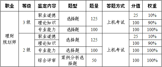 分為理論知識(shí)考試和專業(yè)能力考核。理論知識(shí)考試和專業(yè)能力考核采用閉卷方式,均實(shí)行百分制,成績(jī)達(dá)到60分及以上者為合格,可獲得理財(cái)規(guī)劃師國(guó)家職業(yè)資格三級(jí)的證書(shū)。理財(cái)規(guī)劃師還須進(jìn)行綜合評(píng)審。理論知識(shí)考試、專業(yè)能力考核、綜合評(píng)審三門成績(jī)皆達(dá)60分及以上者為合格,可獲得理財(cái)規(guī)劃師國(guó)家職業(yè)資格二級(jí)的證書(shū)。