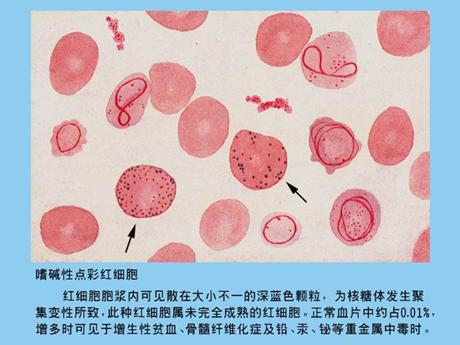 指在瑞氏染色下,胞漿內存在嗜堿性黑藍色顆粒的紅細胞,屬于未完全成熟紅細胞,顆粒大小不一、多少不均。常作為鉛中毒診斷篩選指標。
