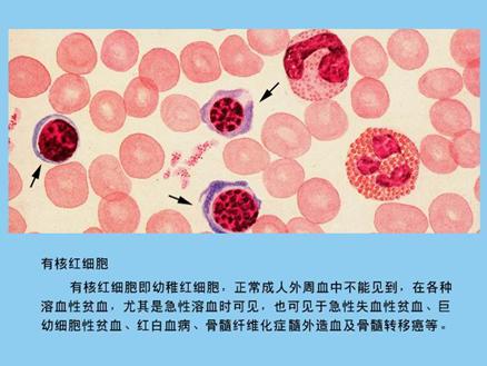 即幼稚紅細胞,出現在外周血為病理現象,見于各種溶血性貧血、白血病。