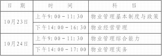2010年度物業(yè)管理師資格考試為首次考試,定于10月23日至24日舉行,具體考試時(shí)間和考試科目如下: