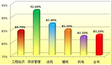 工程經濟84.7%,項目管理92.6%, 法規87.4%, 建筑85.1%, 機電82.5%