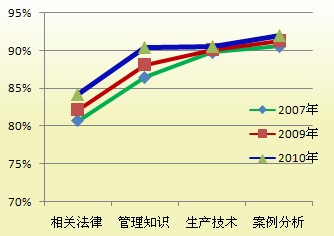 根據(jù)相關(guān)機(jī)構(gòu)公布的數(shù)據(jù),2007年,2009年,2010年注冊(cè)安全工程師考試全科一次性通過(guò)率分別為76.88%、80.17%、81.23%.