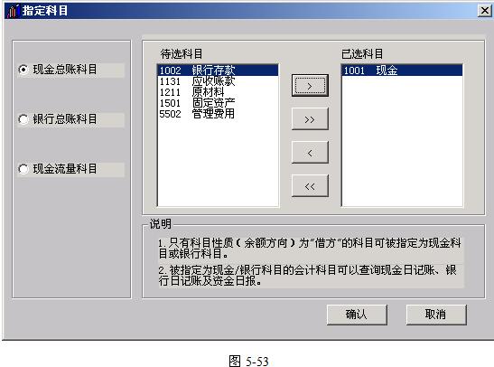 指定會計科目是指定出納專管的科目。指定科目后,才能執(zhí)行出納簽字,從而實現(xiàn)現(xiàn)金、銀行賬管理的保密性,也才能查看現(xiàn)金或銀行存款日記賬。