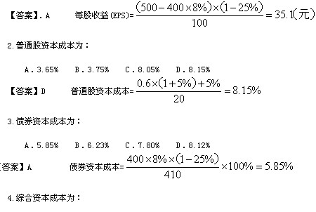 1.某公司目前發(fā)行在外普通股100萬股,每股面值1元,最近一年支付的每股股利為0.6元,股利固定增長率(g)為5%,普通股市價(jià)為每股20元。發(fā)行在外的債券總面值為400萬元,票面利率為8%,債券的總市價(jià)為410萬元。股票和債券的籌資費(fèi)用均忽略不計(jì)。