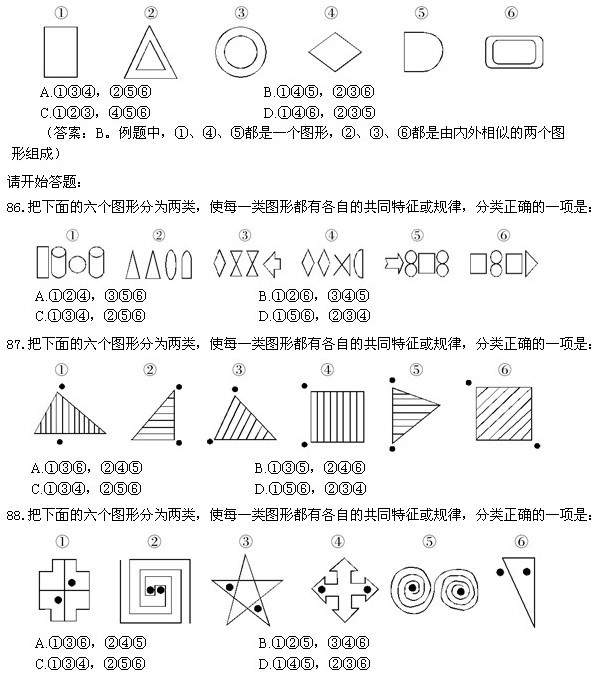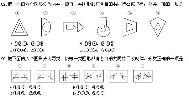 以下86-90題,每個(gè)題目包含六個(gè)圖形,請(qǐng)把此六個(gè)圖形分為兩類,使得每一類圖形都有各自的共同特征或規(guī)律。